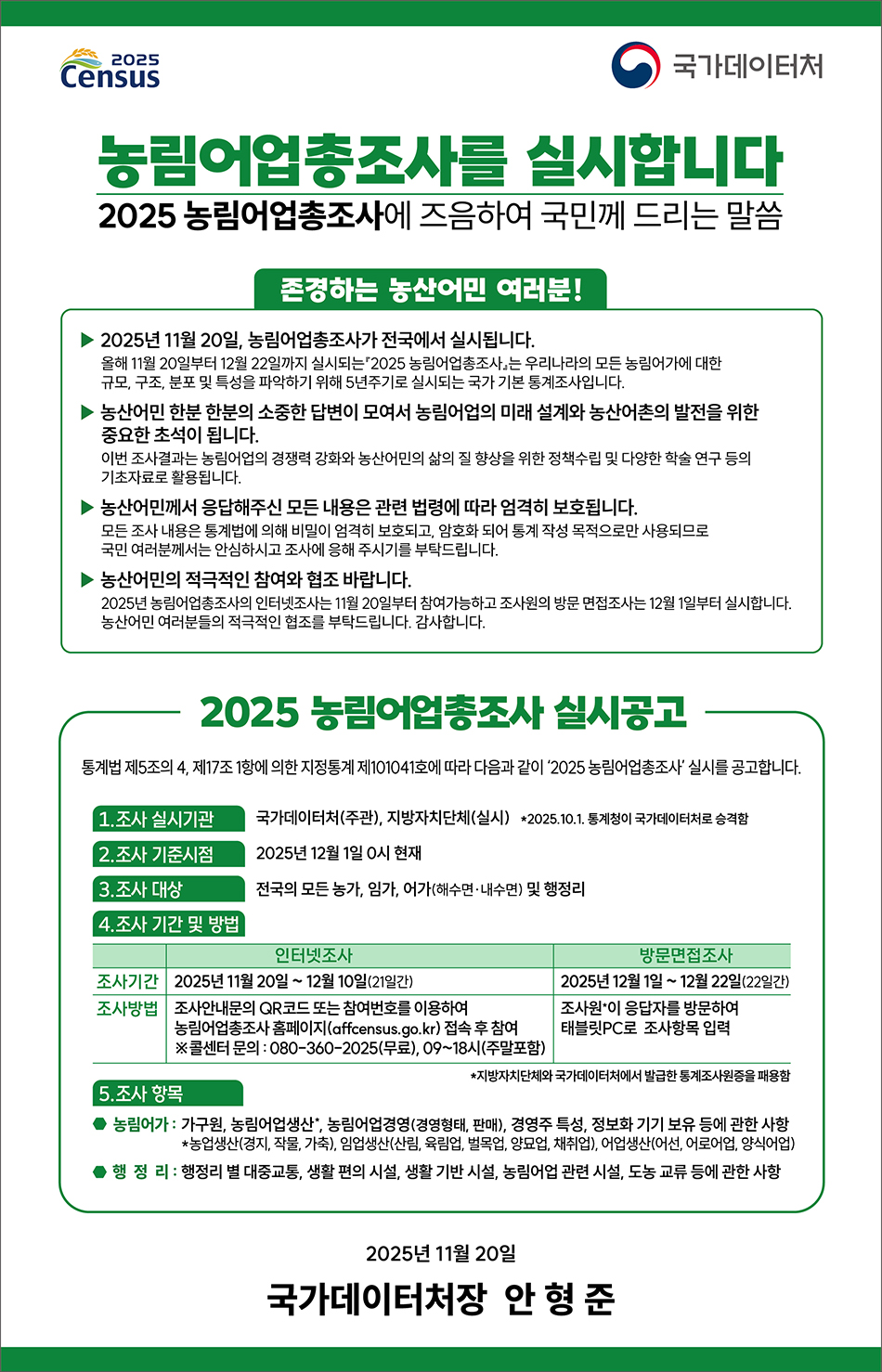 2025 농림어업총조사 담화문 및 실시공고문을 게시합니다.